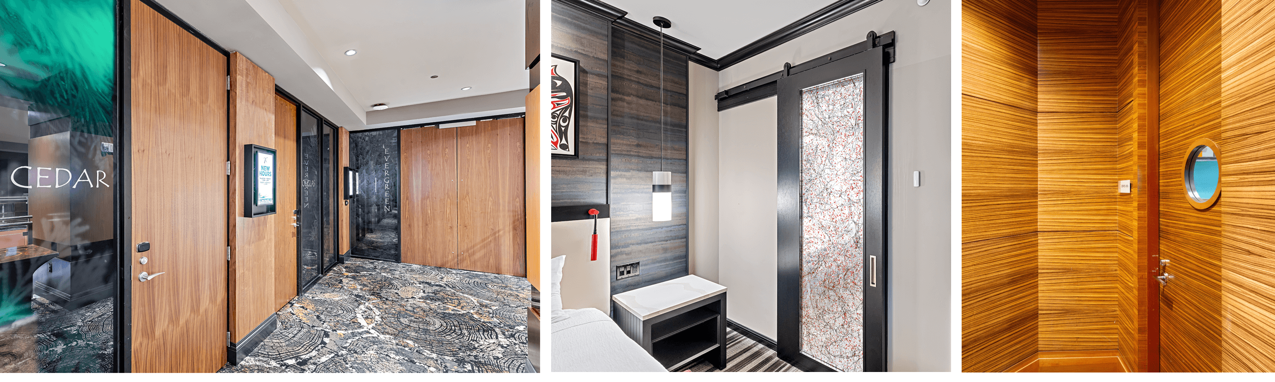 Fire-Rated Doors up to 90 minutes | Acoustic STC-Rated Doors up to STC 45 | Ballistic Resistant Doors Levels 1-8 | Oversized Doors over 10 ft and over 5 ft wide | Wood Grooves | Metal Inlays | Glass Inserts | Raised Mouldings | Matching Wood Frames | Custom Stain Finishing | Matching Wall Panels | Exterior Wood Doors